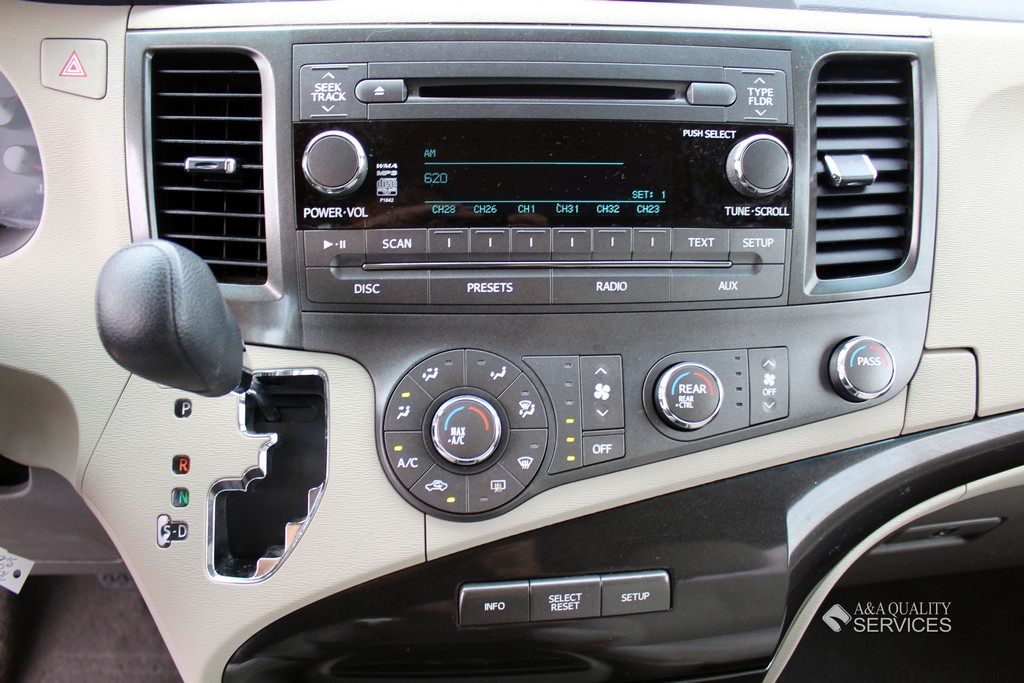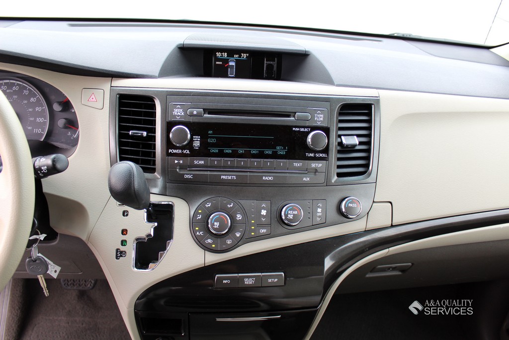 The base Sienna includes 17-inch alloy wheels, dual sliding rear doors with power-down windows, triple-zone air-conditioning, full power accessories, a telescoping steering wheel, cruise control and a four-speaker CD/MP3 stereo with an auxiliary audio jack. LE adds privacy glass, heated side mirrors, steering-wheel-mounted audio controls, a 3.5-inch display (includes a back-up monitor), floor and overhead consoles and an 8-way (manual) driver seat. The LE V6 adds a roof rack, power-sliding side doors, auto-dimming rearview mirror, power lumbar supports (front seats), second- and third-row sunshades, Bluetooth and a six-speaker audio system (with satellite radio, a USB jack, iPod connectivity and Bluetooth audio).