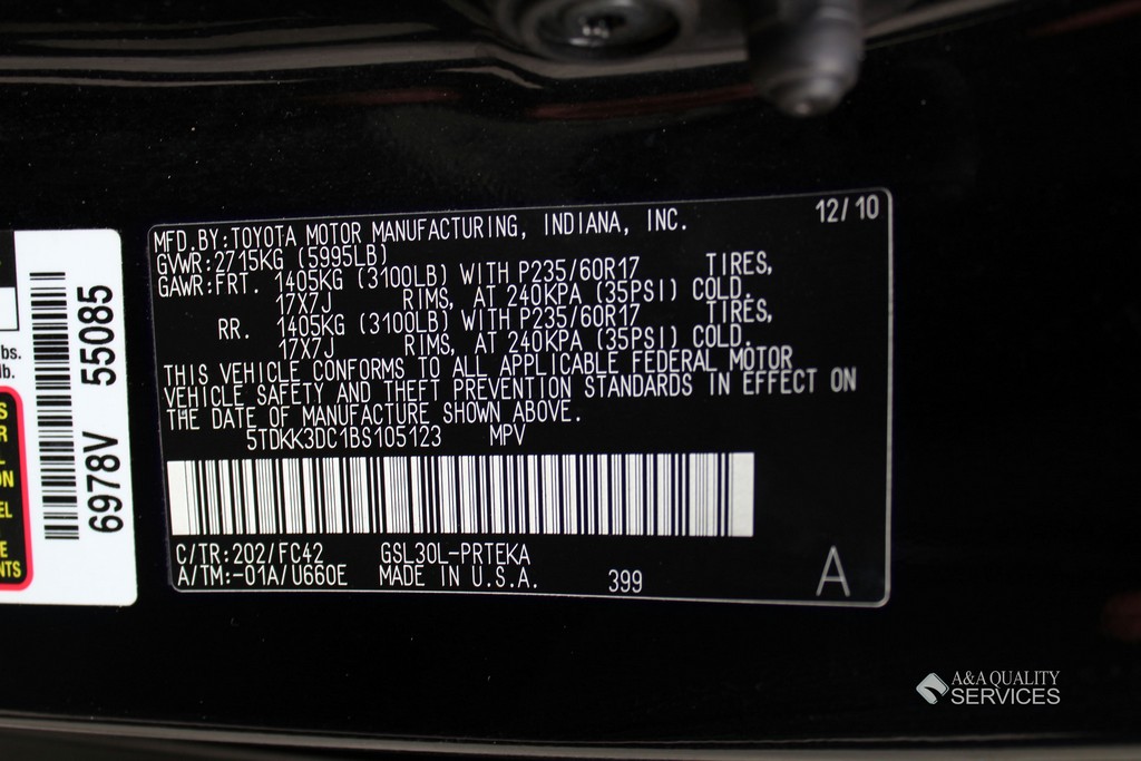 | Transmission: | Automatic | Engine: | 6 Cylinder 3.5L | VIN: | 5TDKK3DC1BS105123 |